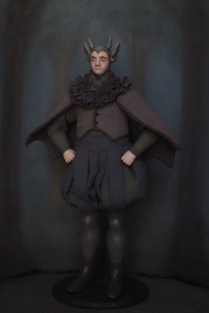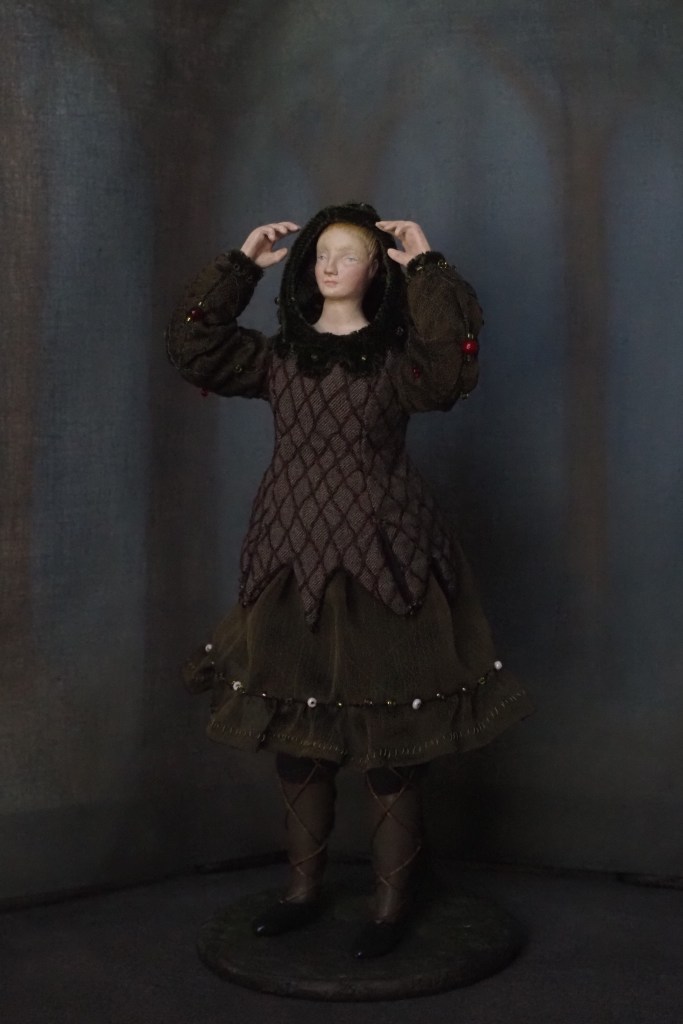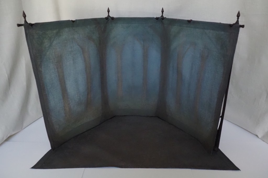 Another inspiration is theatrical costumes and stage design. The background of the photographs is a miniature painted curtain, painted with the design of a forest in the evening. I created a miniature curtain and curtain holder, with similar fantastical design elements. I can’t help but also think of A Midsummer Night’s Dream, though this was not intentional. I designed the curtain rail in a way where I can change out the curtain, so I am able to create new scenery later in the project if I choose to do so.